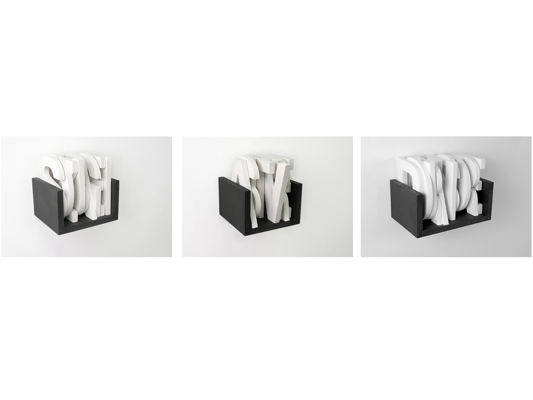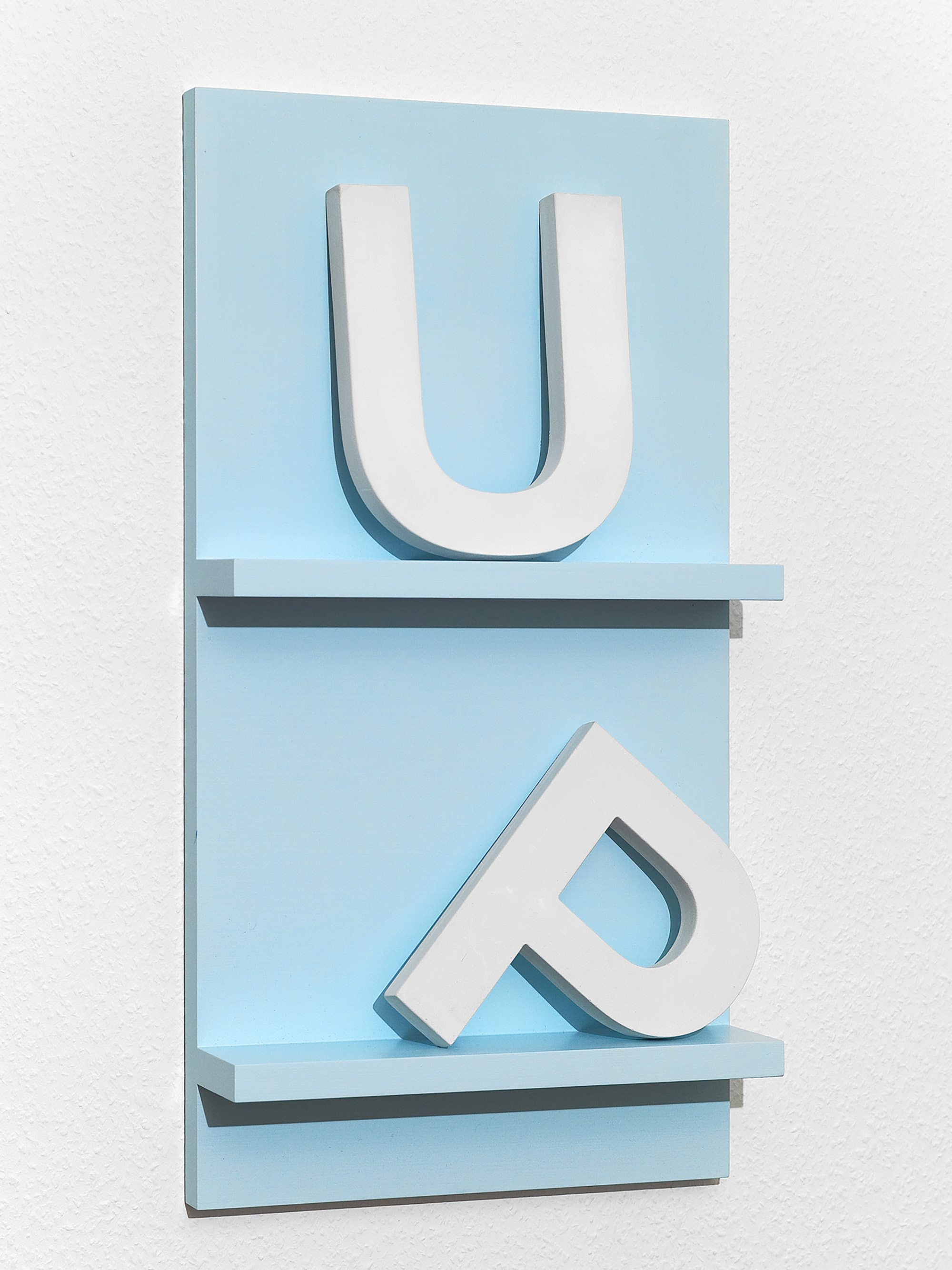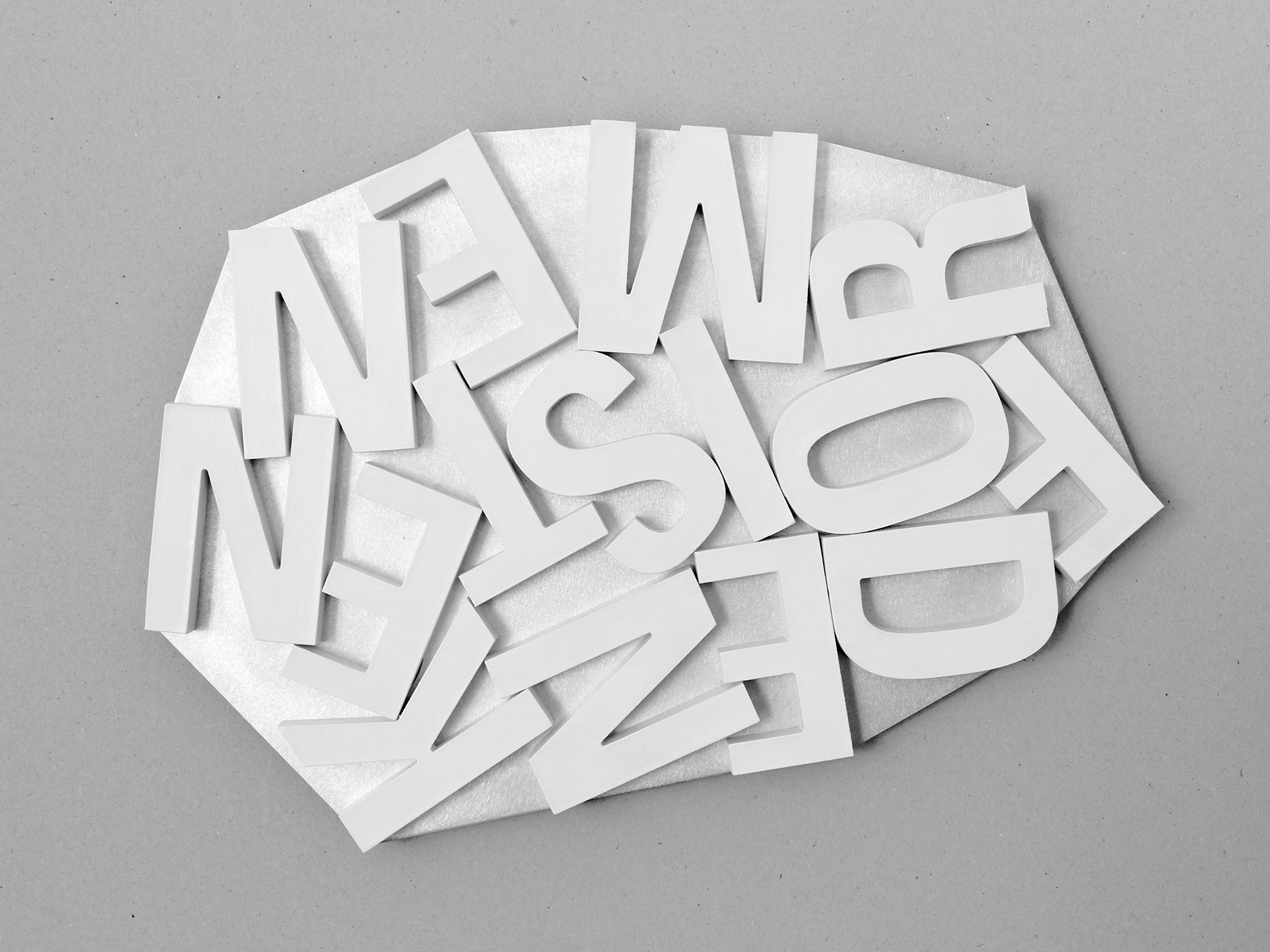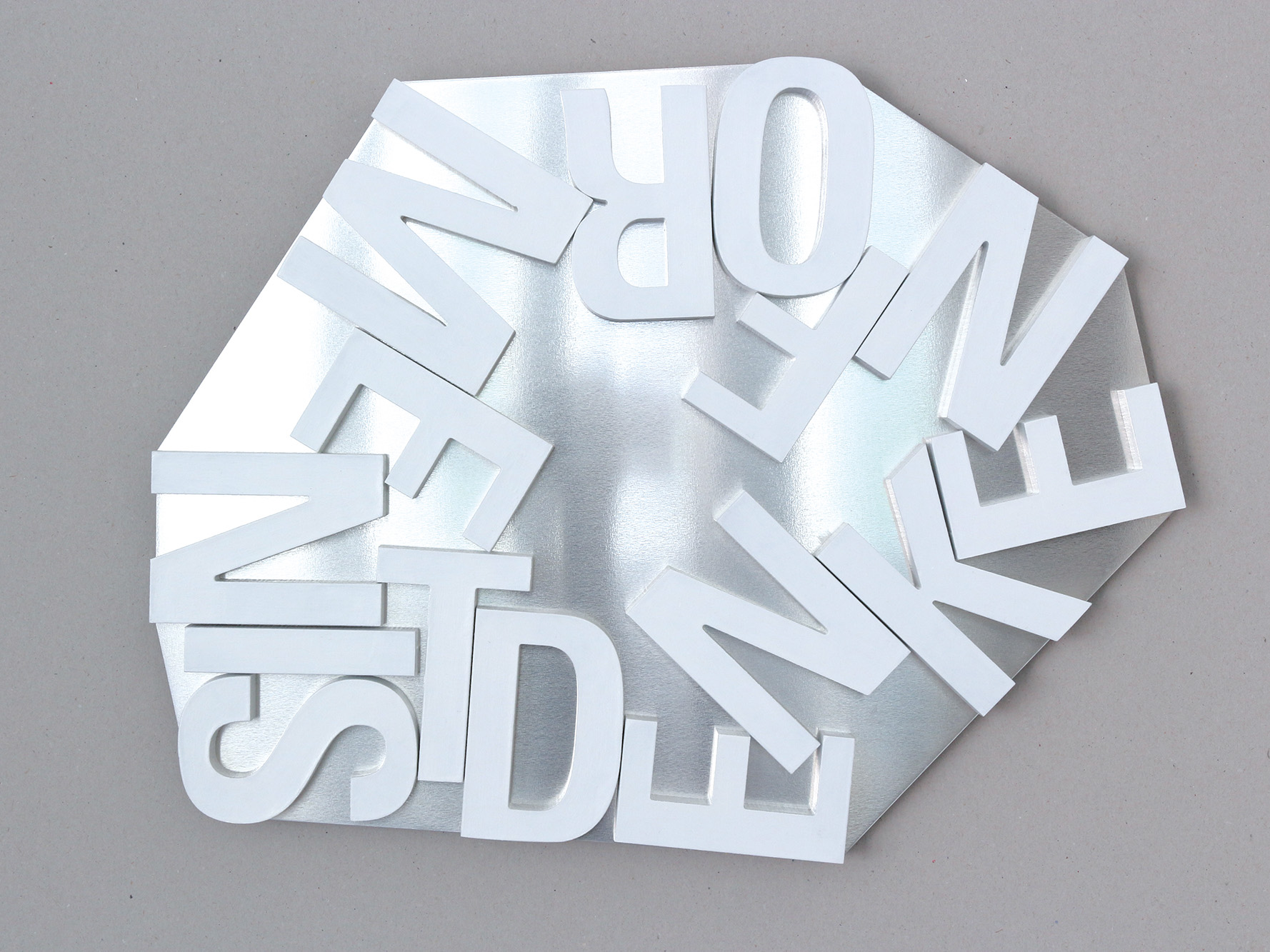 15 Buchstaben aus Holz, weiss bemalt, Aluminiumplatte mit mattspiegelnder Oberfläche, 34.5 × 44 × 5 cm