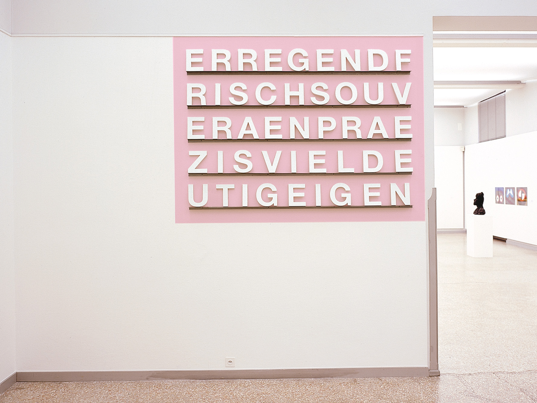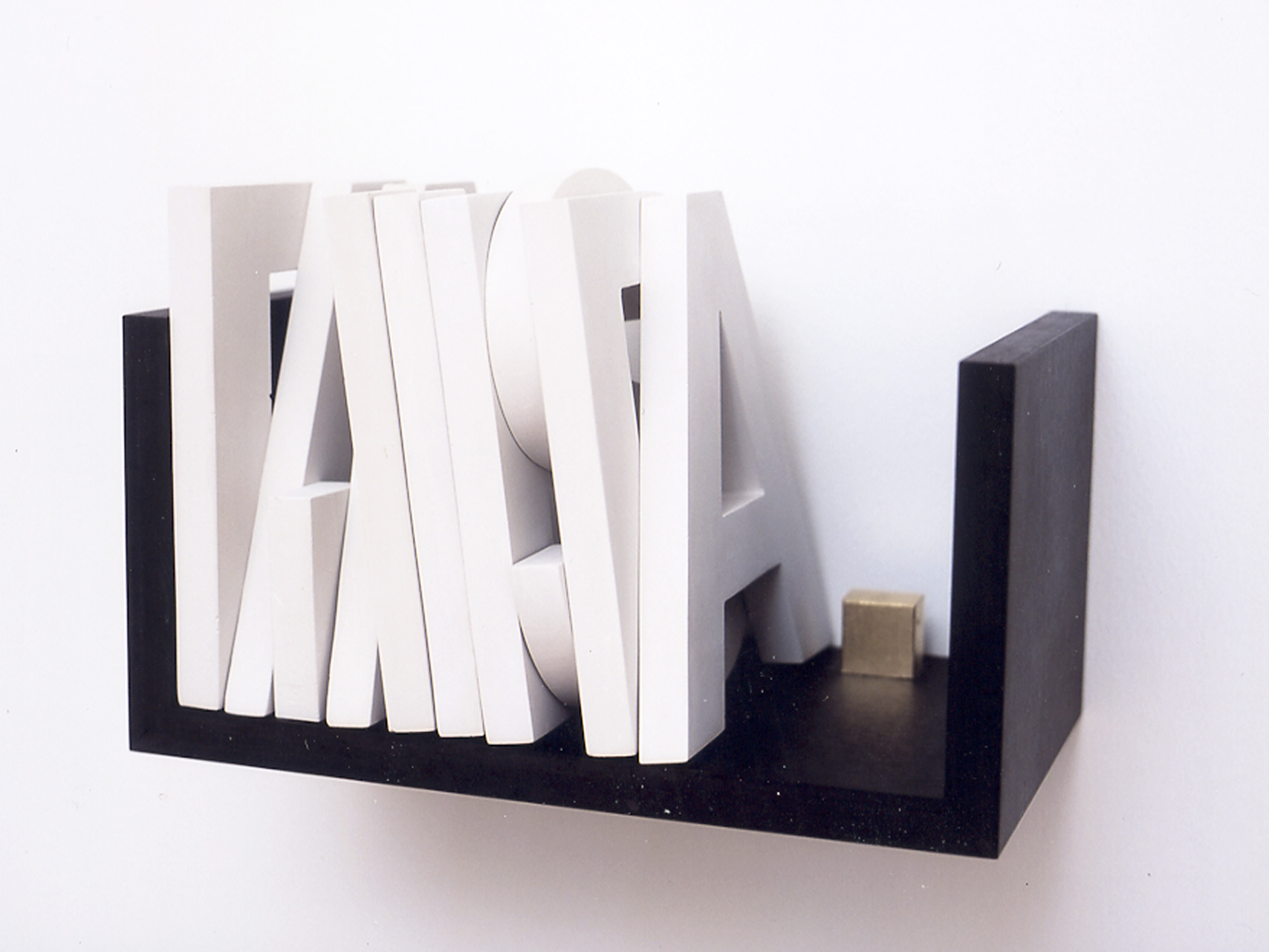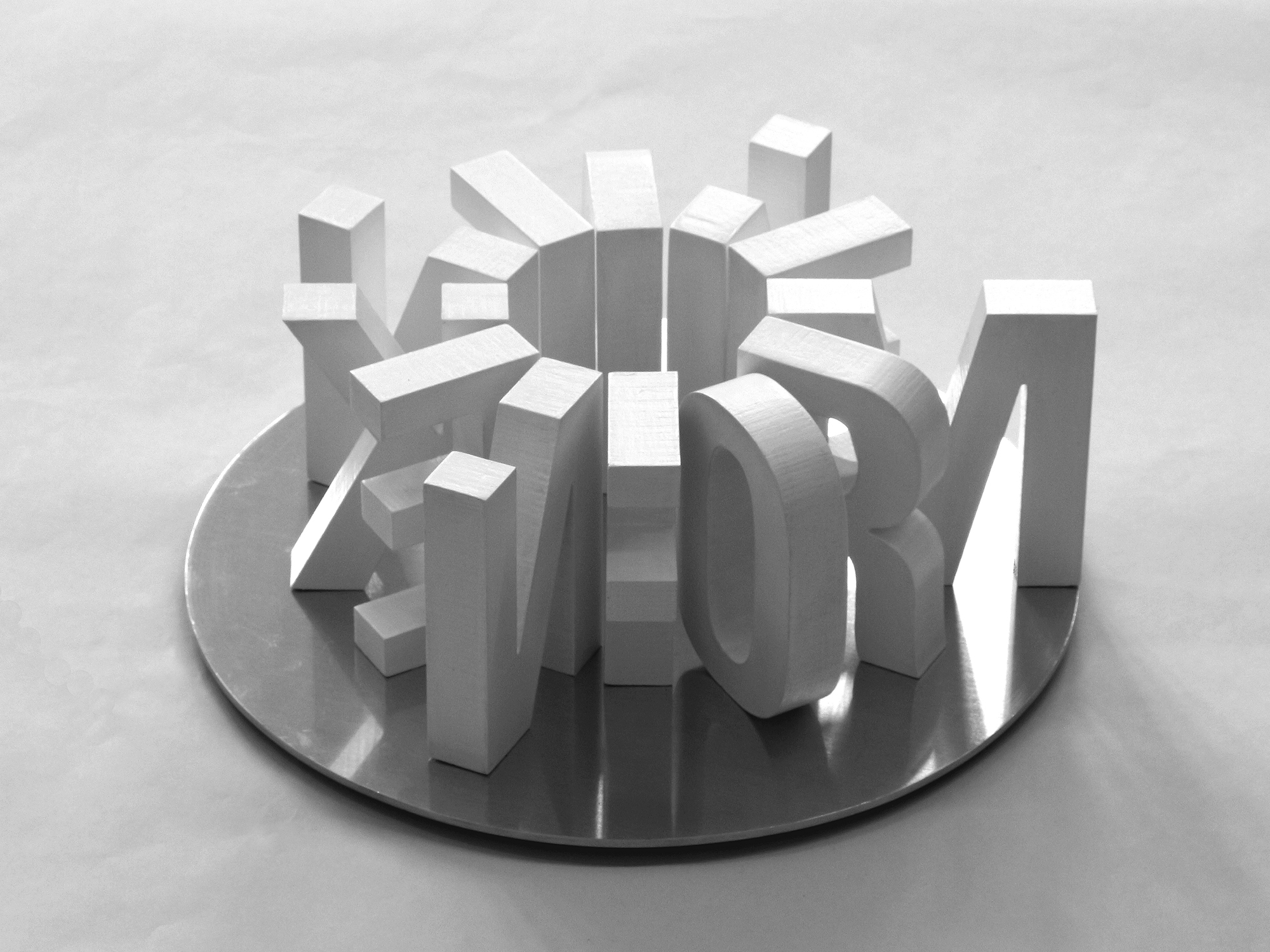15 Buchstaben aus Holz, weiss bemalt, Aluminiumplatte mit mattspiegelnder Oberfläche, 34.5 × 44 × 5 cm