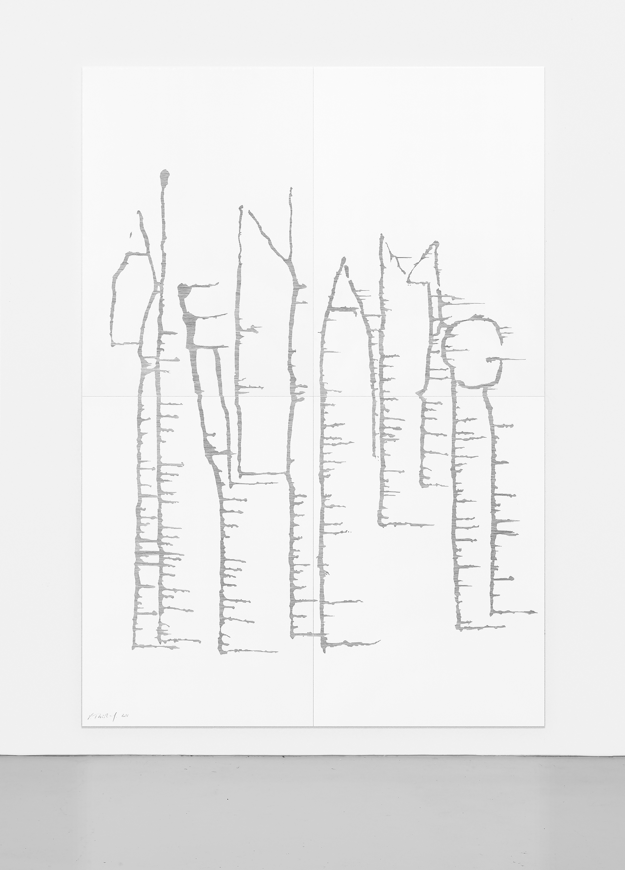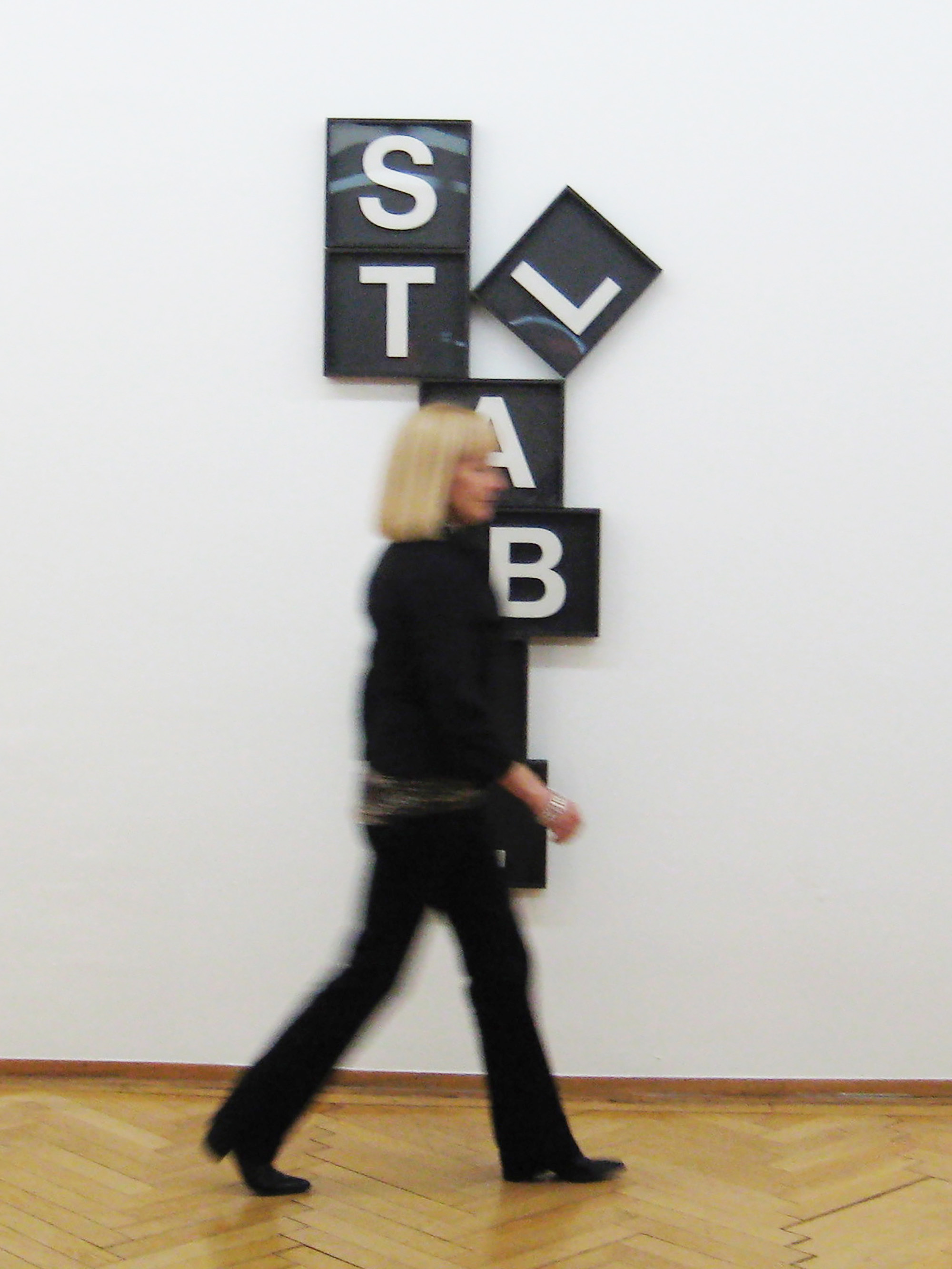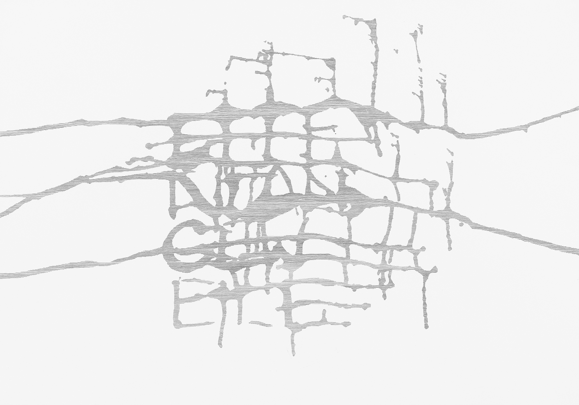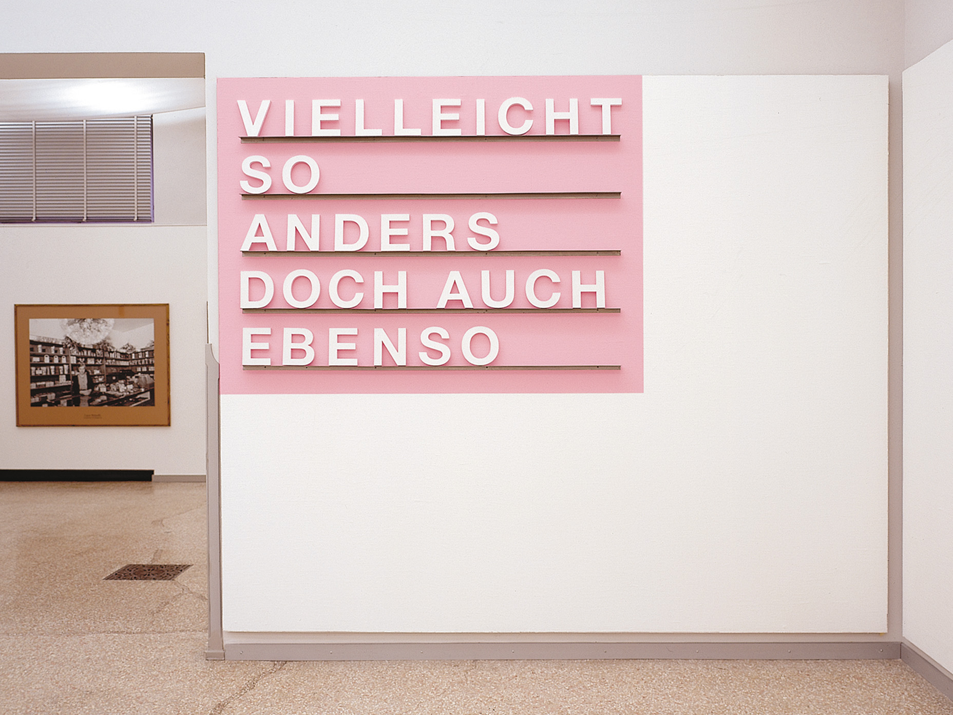 15 Buchstaben aus Holz, weiss bemalt, Aluminiumplatte mit mattspiegelnder Oberfläche, 34.5 × 44 × 5 cm