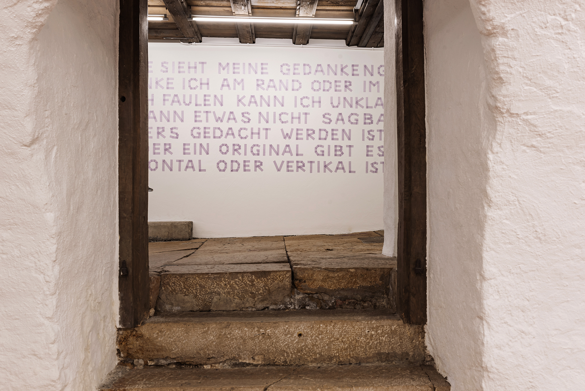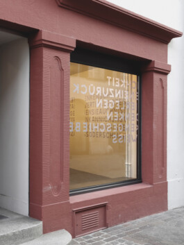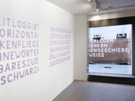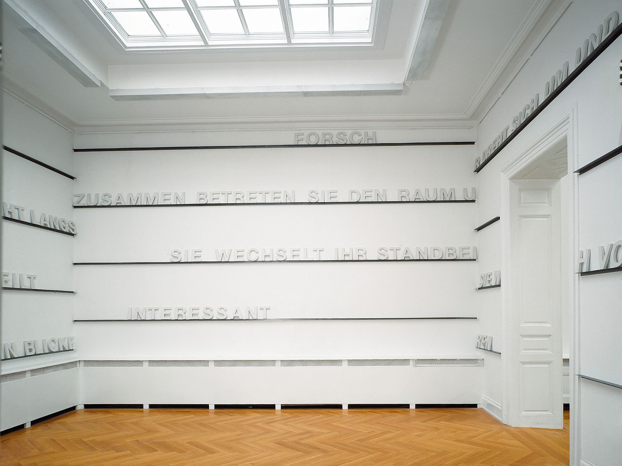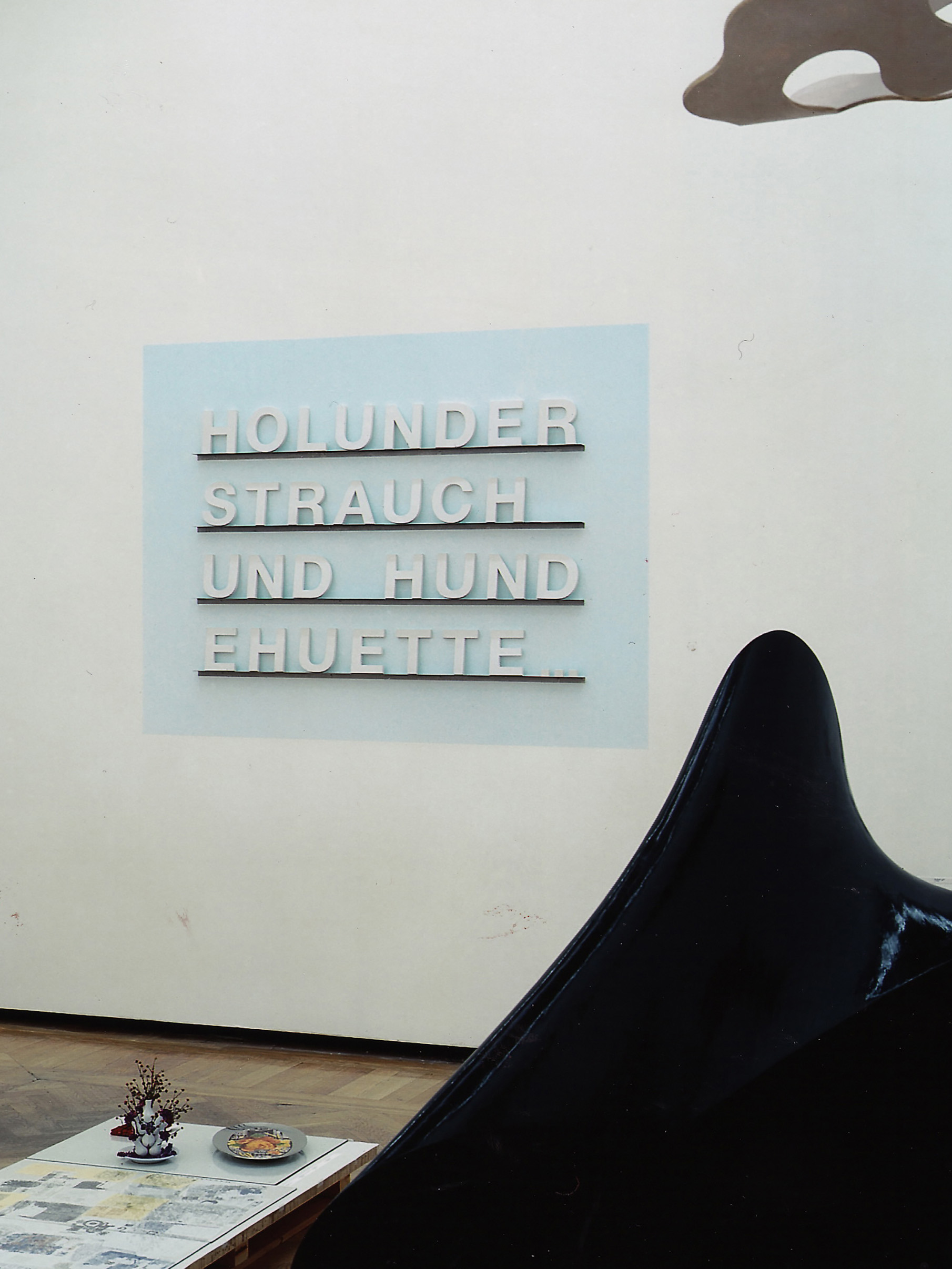 Drei im Lesefluss zusammenhängende Textfelder über die Wand zum Fenster hin