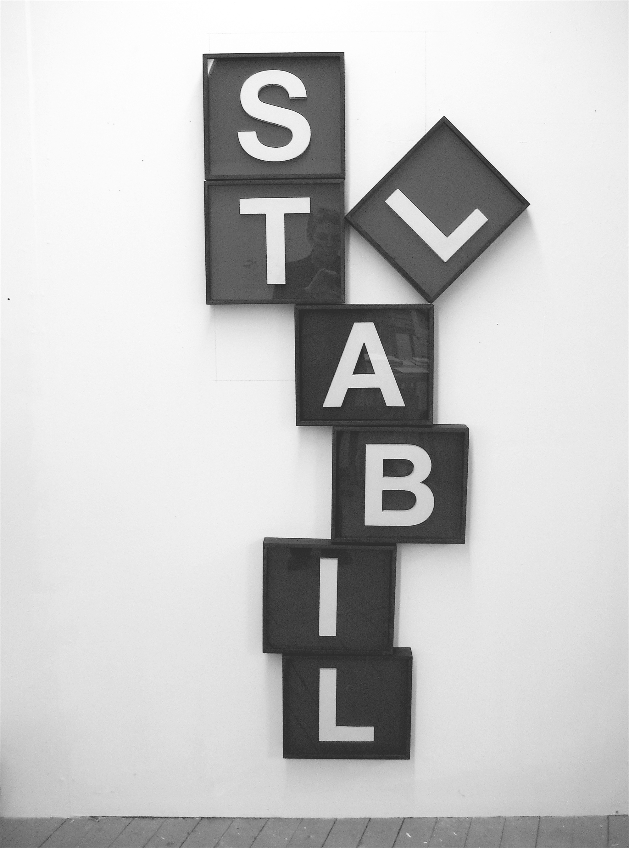 Die Buchstaben stehen lose auf einem Aluminiumwinkel und lehnen an die Wand, die Satzzeichen sind an der Wand befestigt.