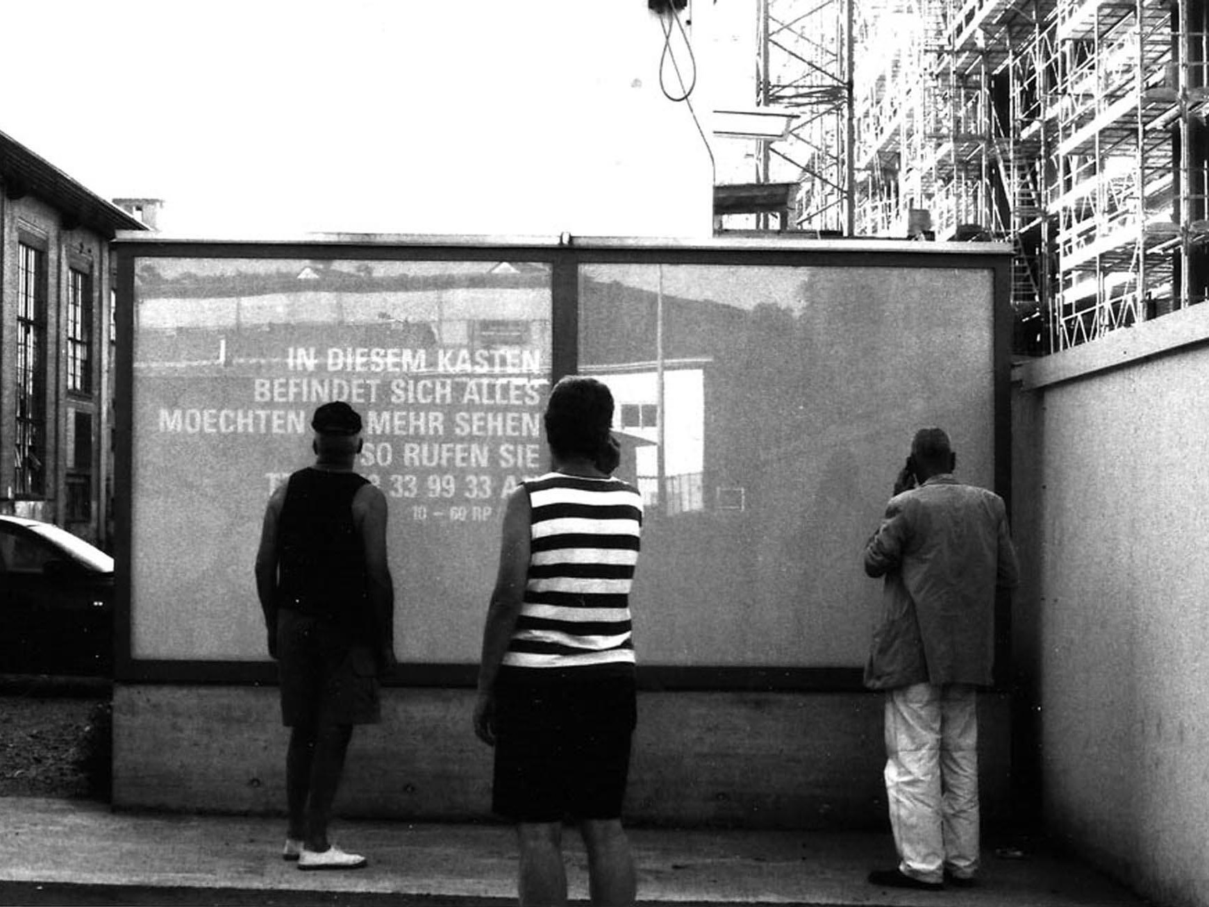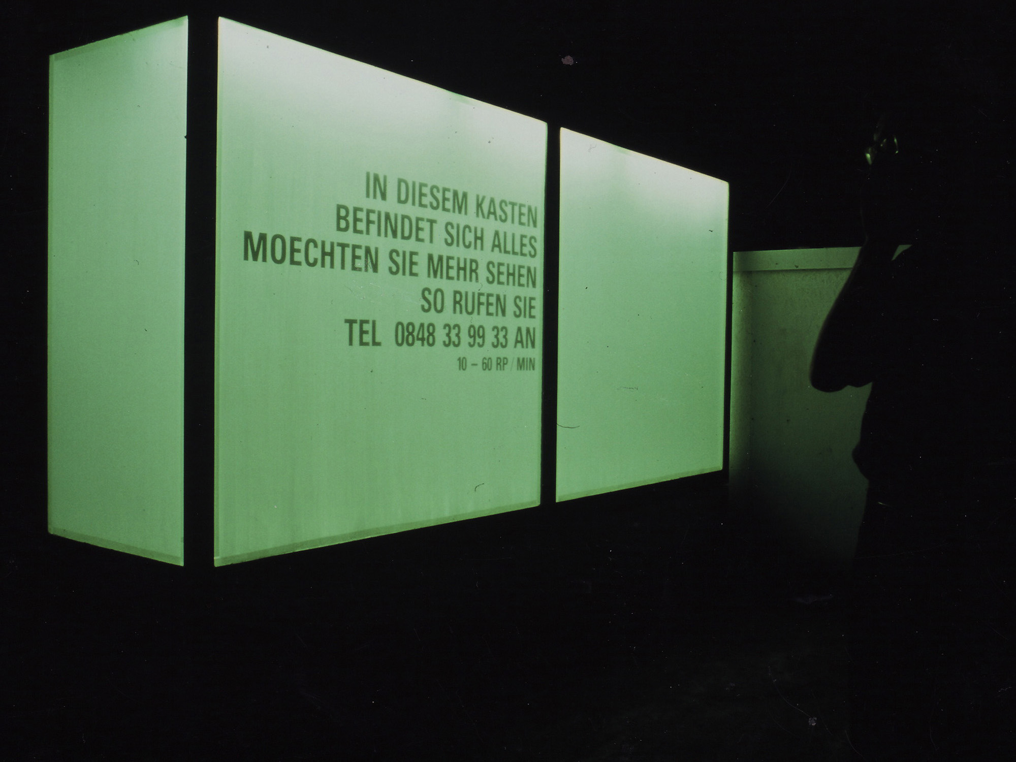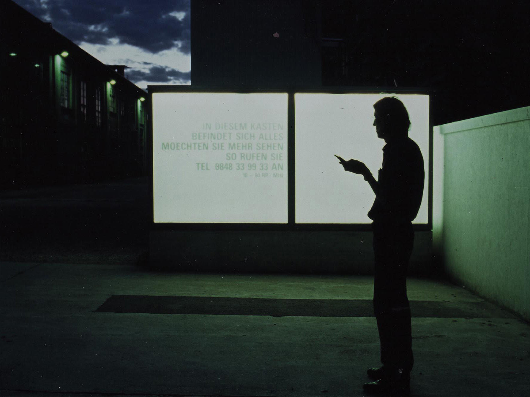 Von innen weiss bemalte Glasvitrine im öffentlichen Raum, Klebeschrift, nachts Innenbeleuchtung, temporärer Telefonanschluss mit zu hörendem Text