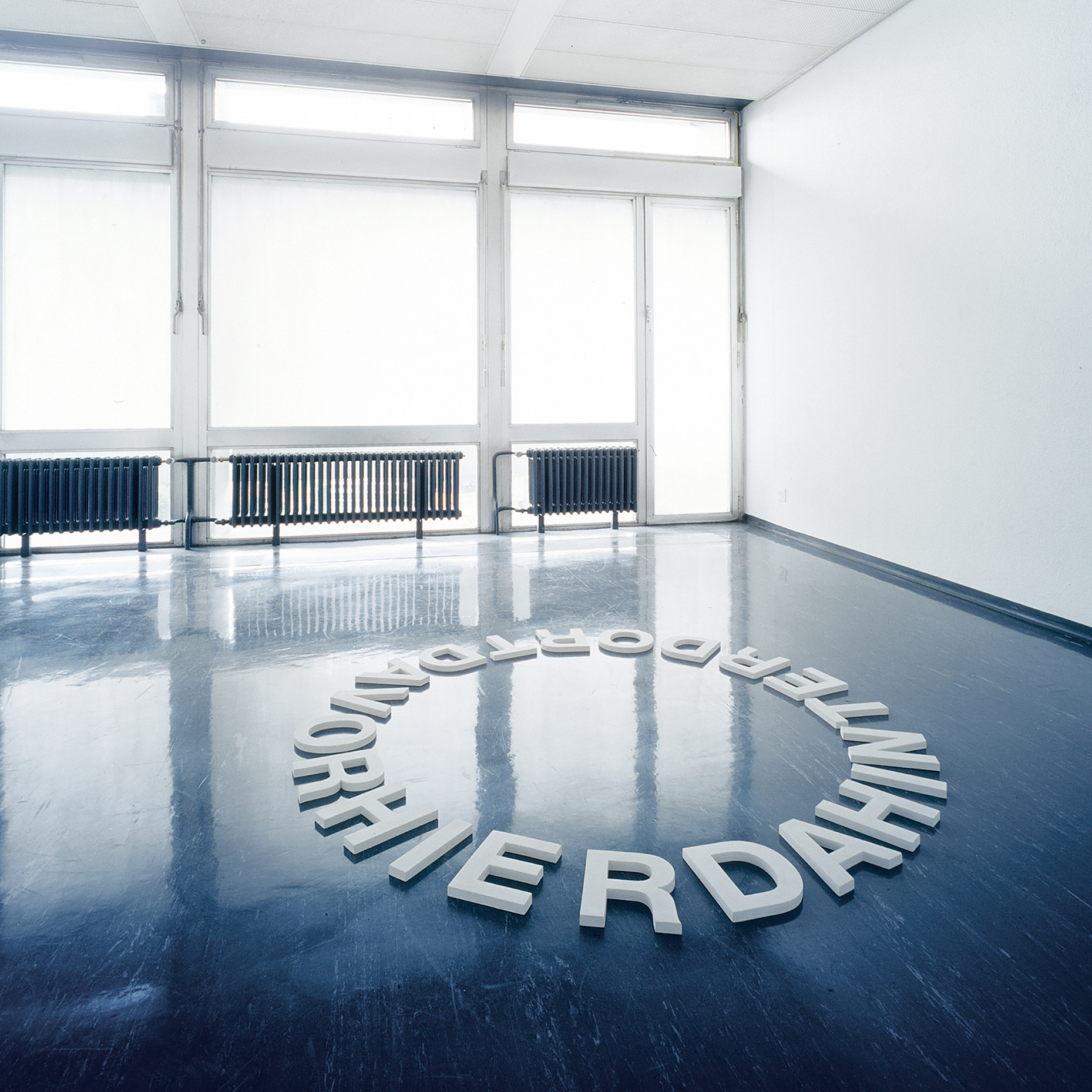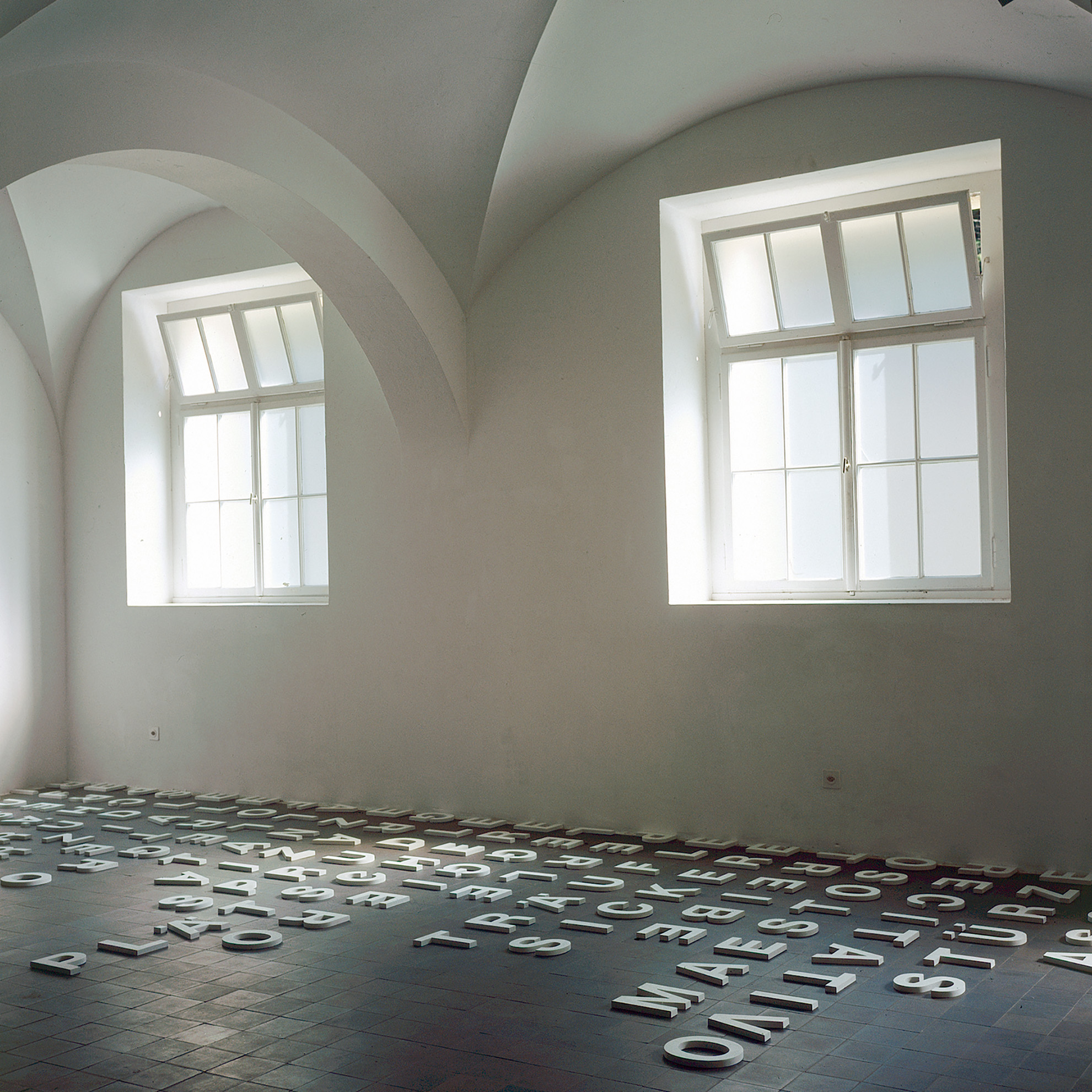 Buchstaben (Versalhöhe 20 cm), aus Gips gegossen, liegen lose auf dem Boden, ∅ 160 cm