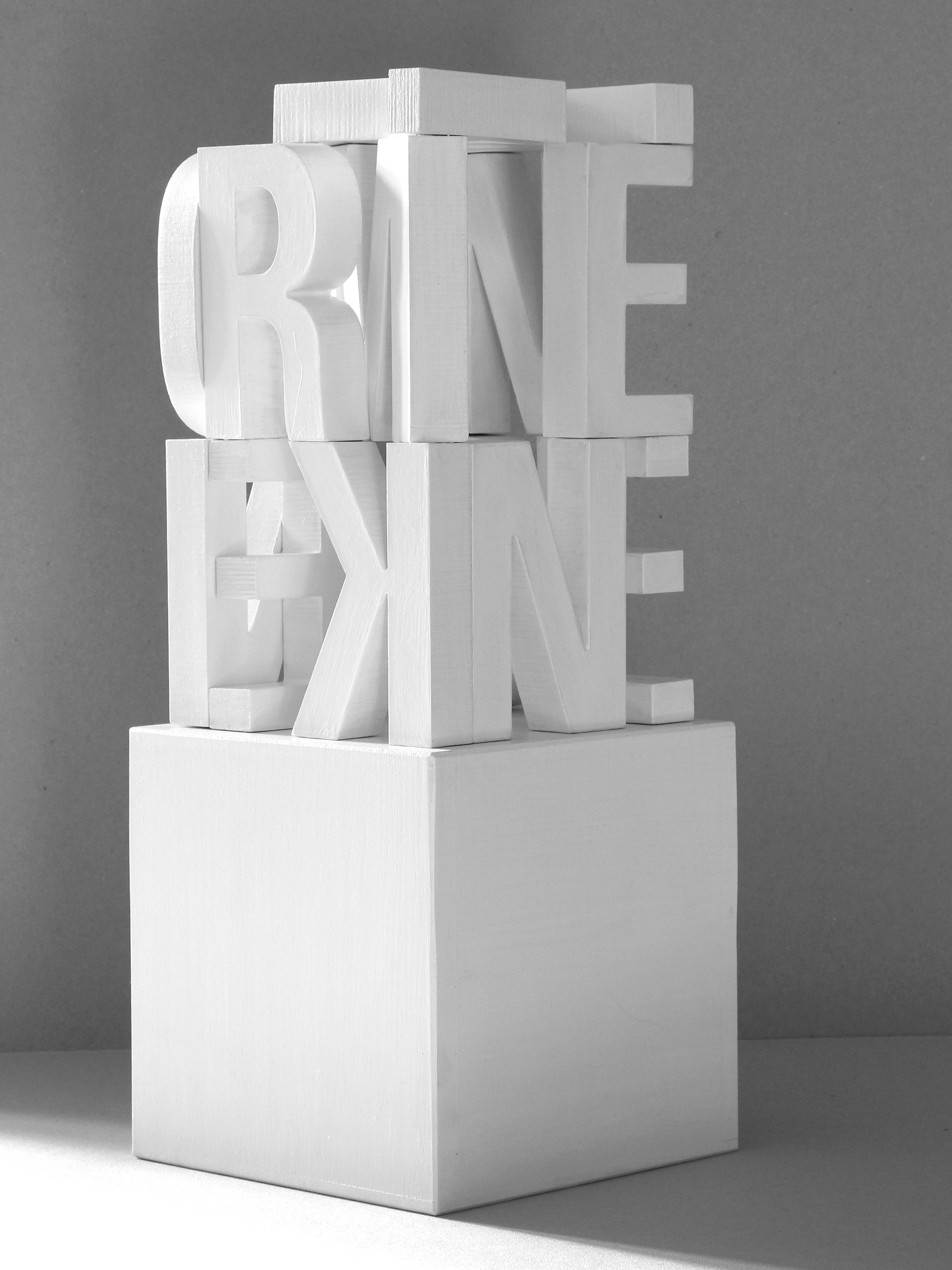15 Buchstaben aus Holz, weiss bemalt, Plastikfolienband, Sockel aus mitteldichter Holzfaserplatte (MDF), Gesamtmasse 42 × 15 × 15 cm