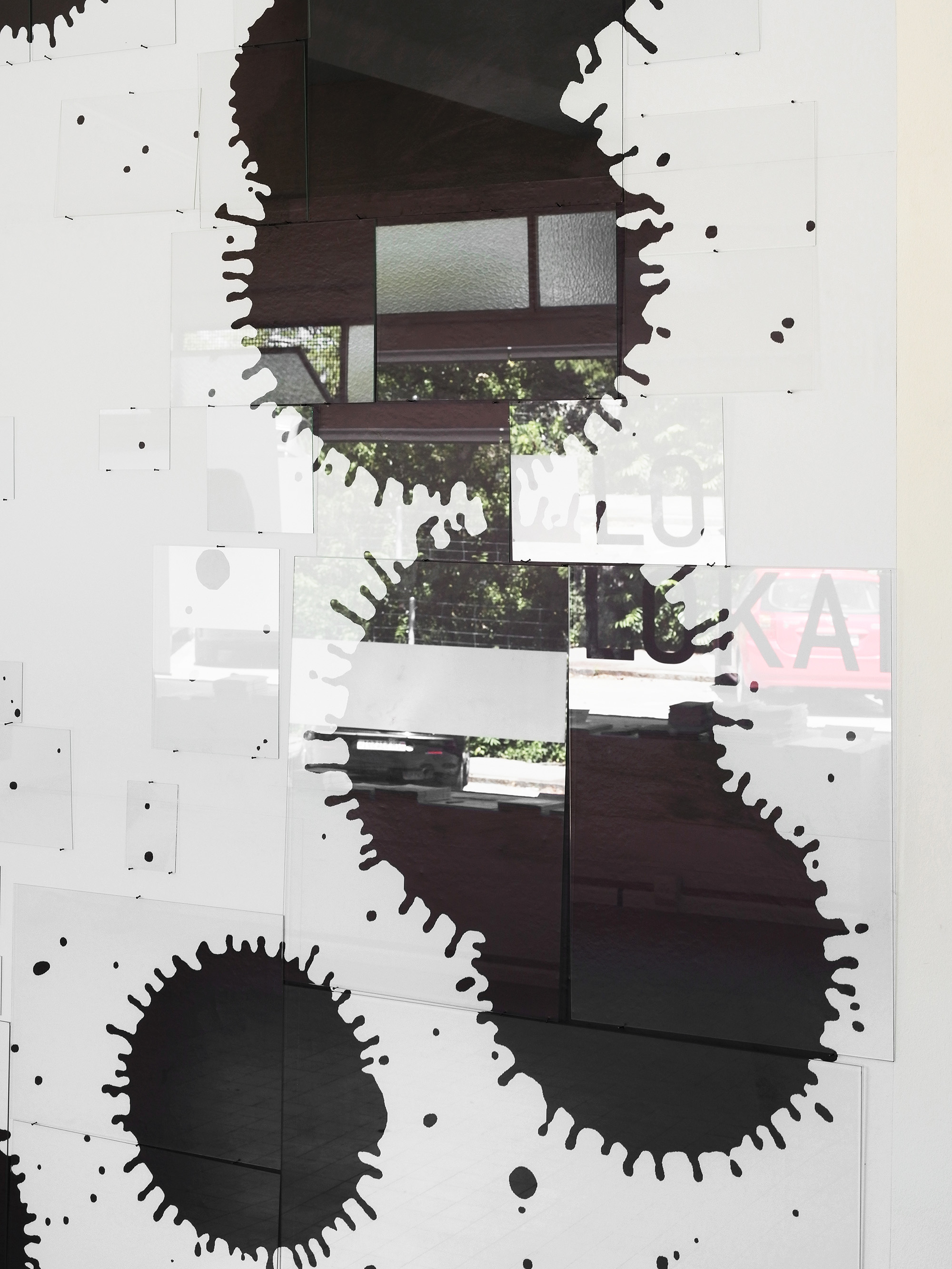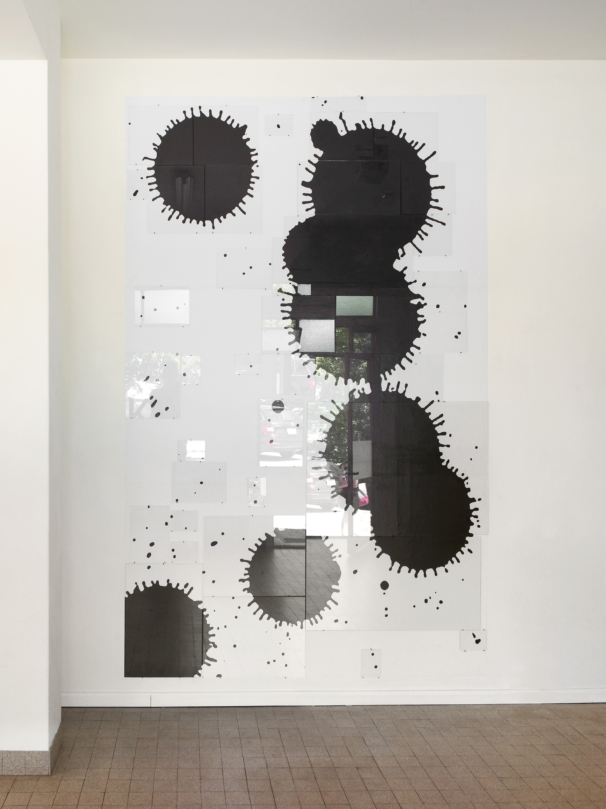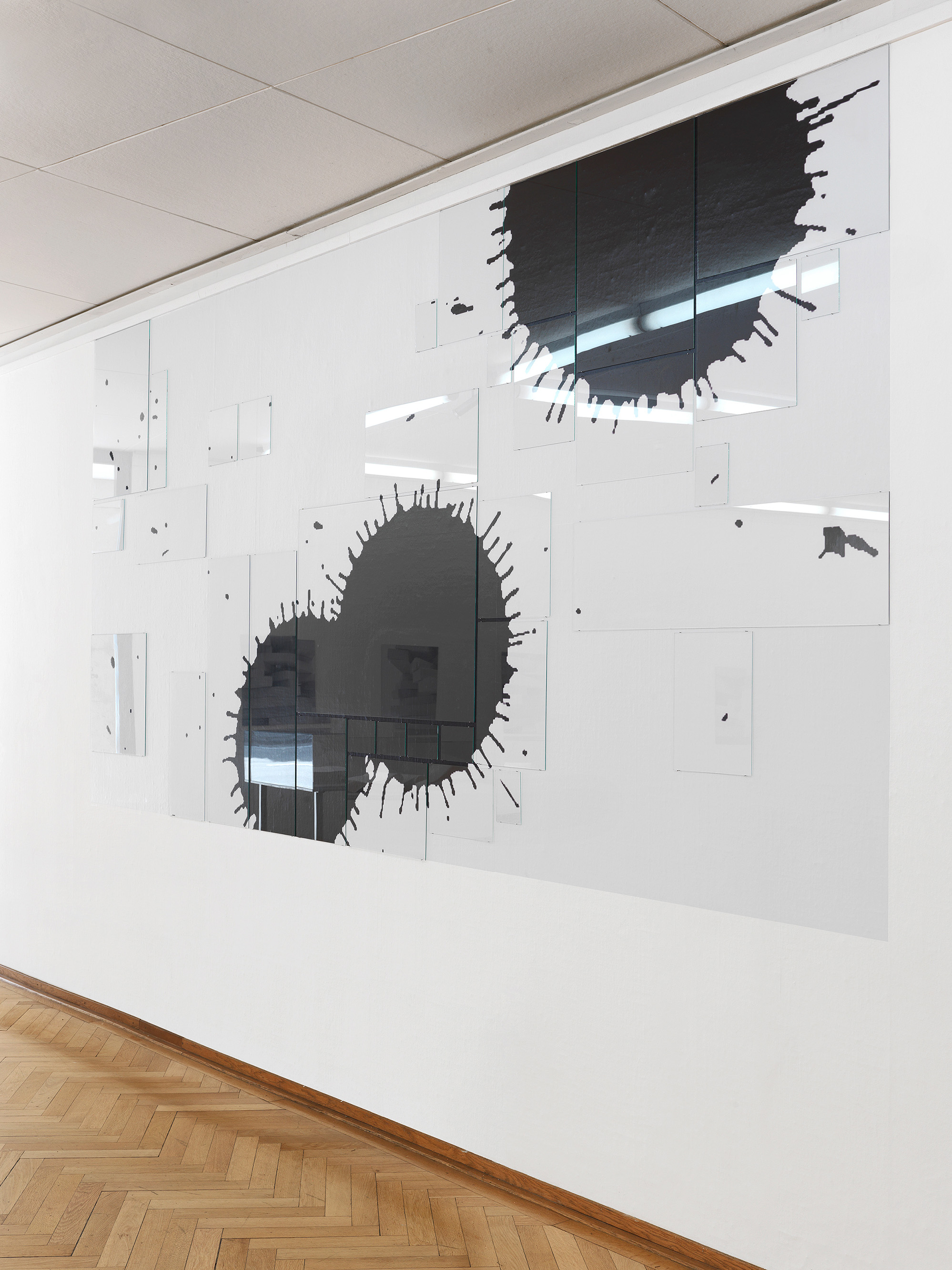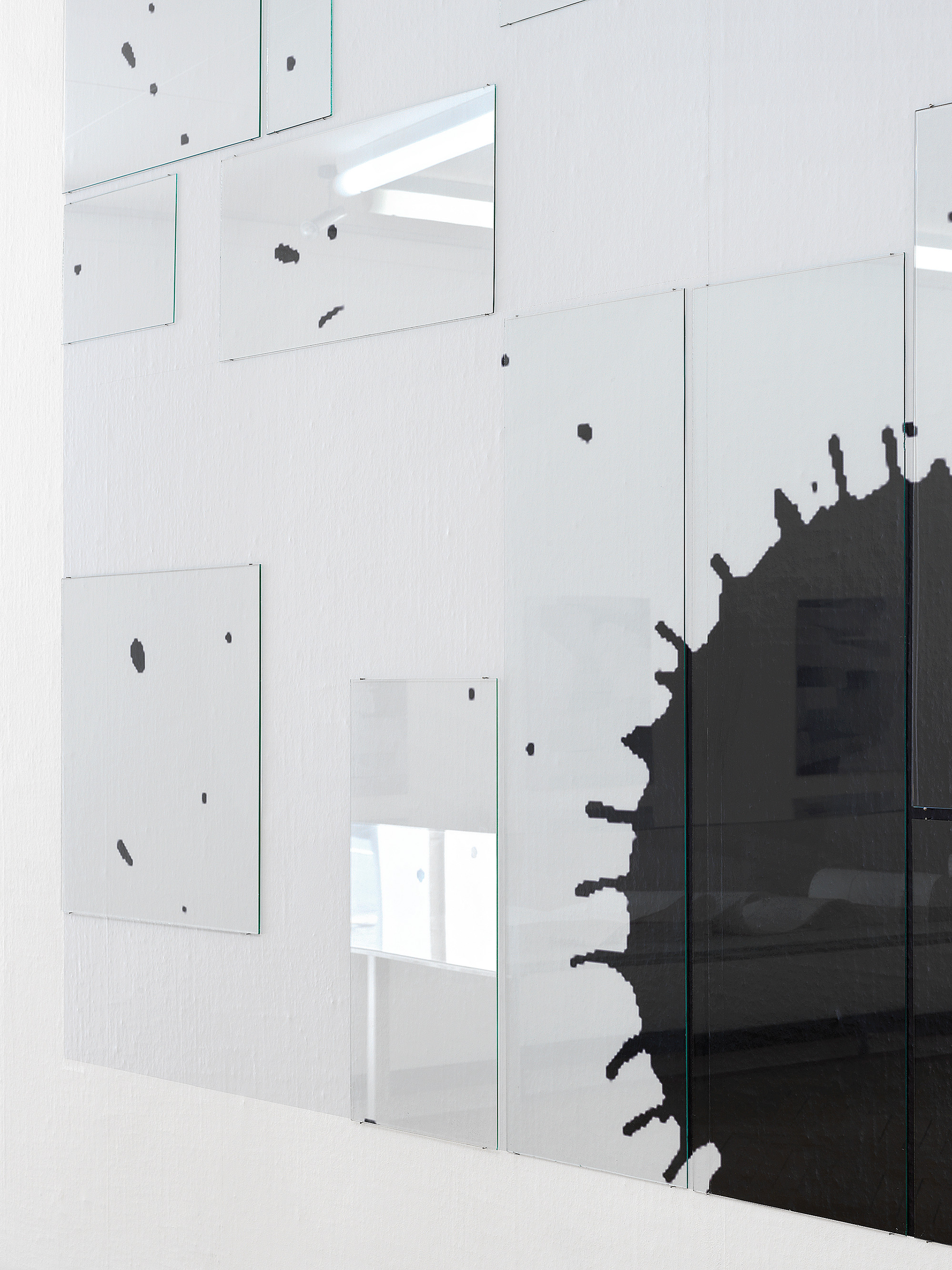 Papier direkt auf die Wand gekleistert, Glasplatten verschiedener Grössen aus dem Fundus des Kunstmuseums Olten, Nägel, Bildgrösse 200 × 390 cm