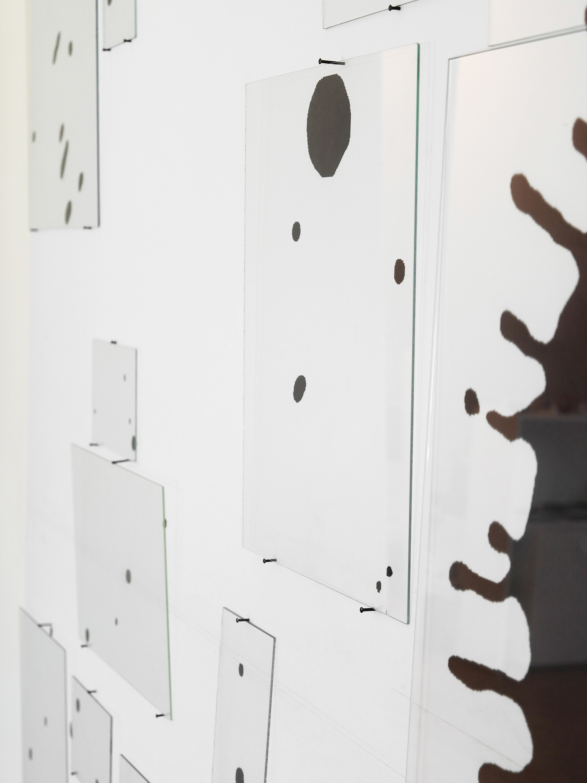 Papier auf die Wand gekleistert, Glasplatten verschiedener Grössen, Nägel, Bildgrösse 300 × 120 cm