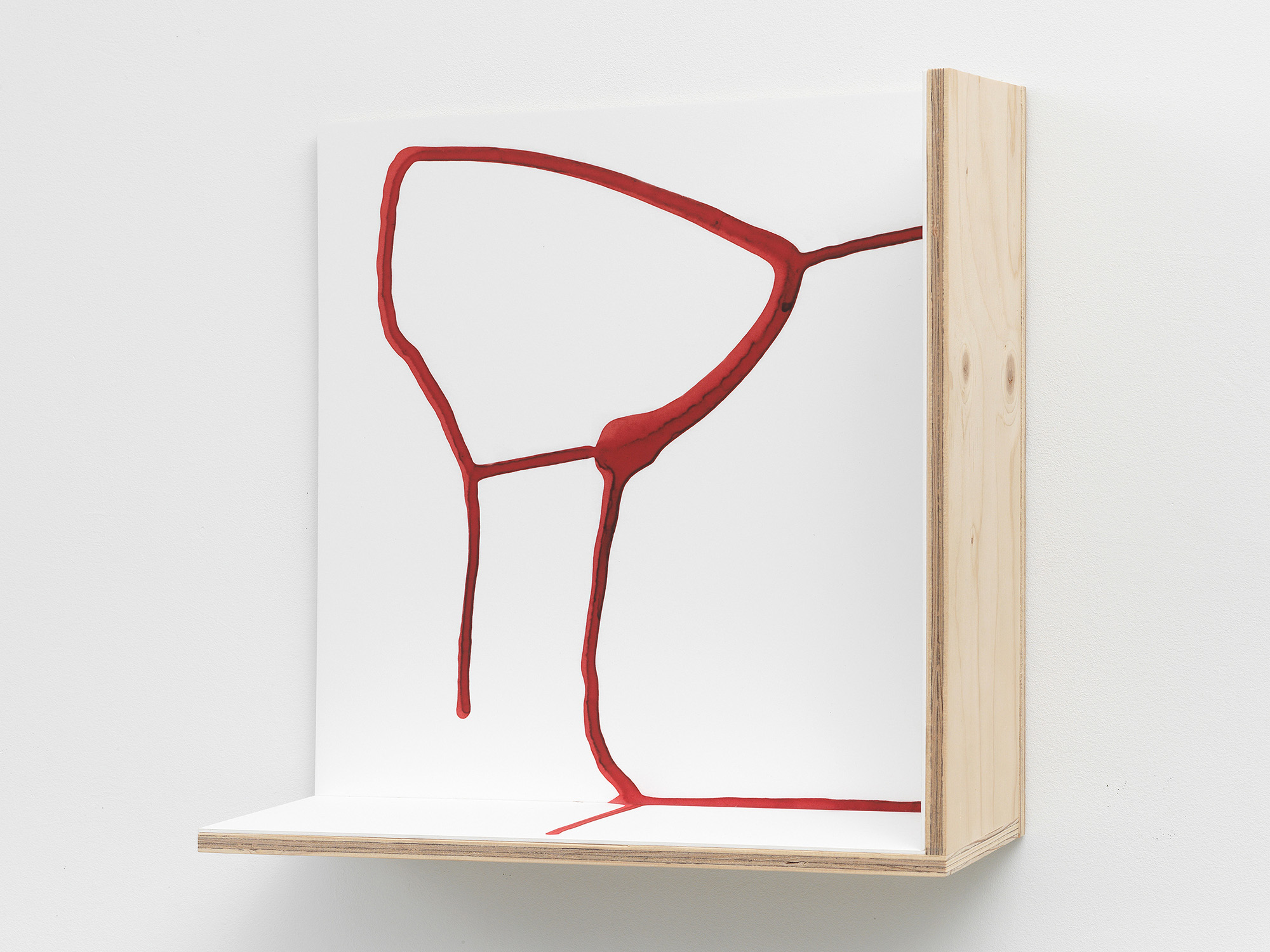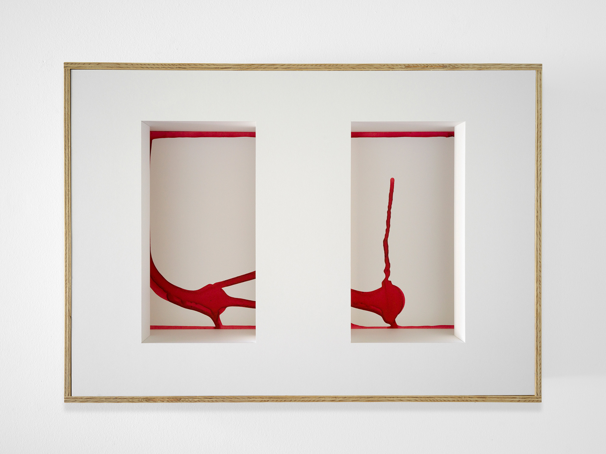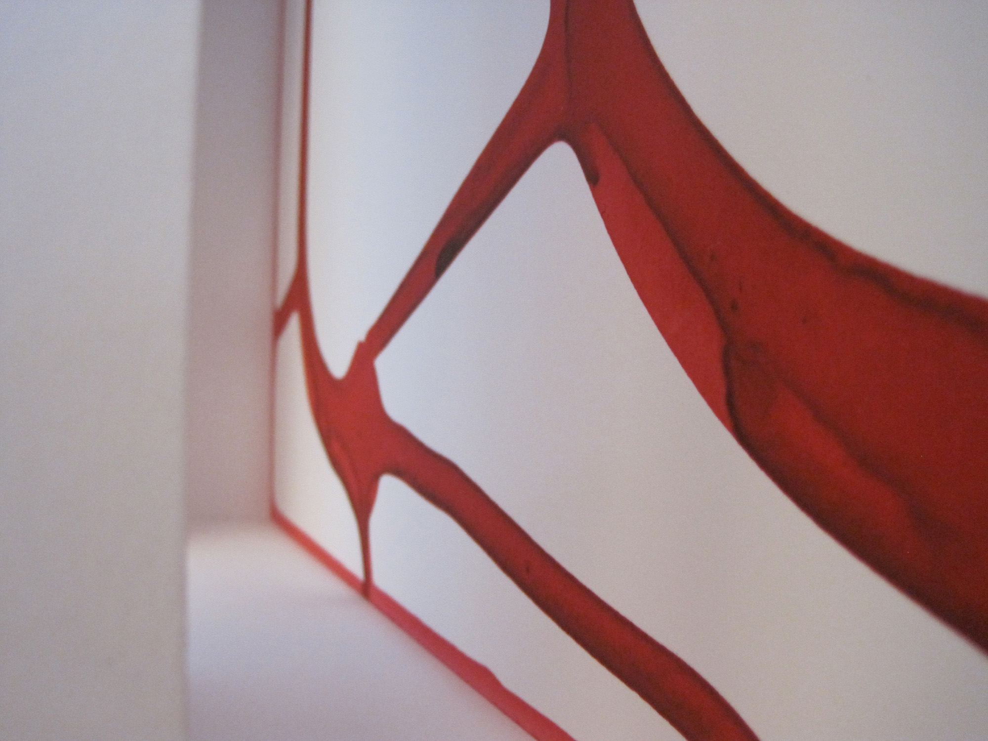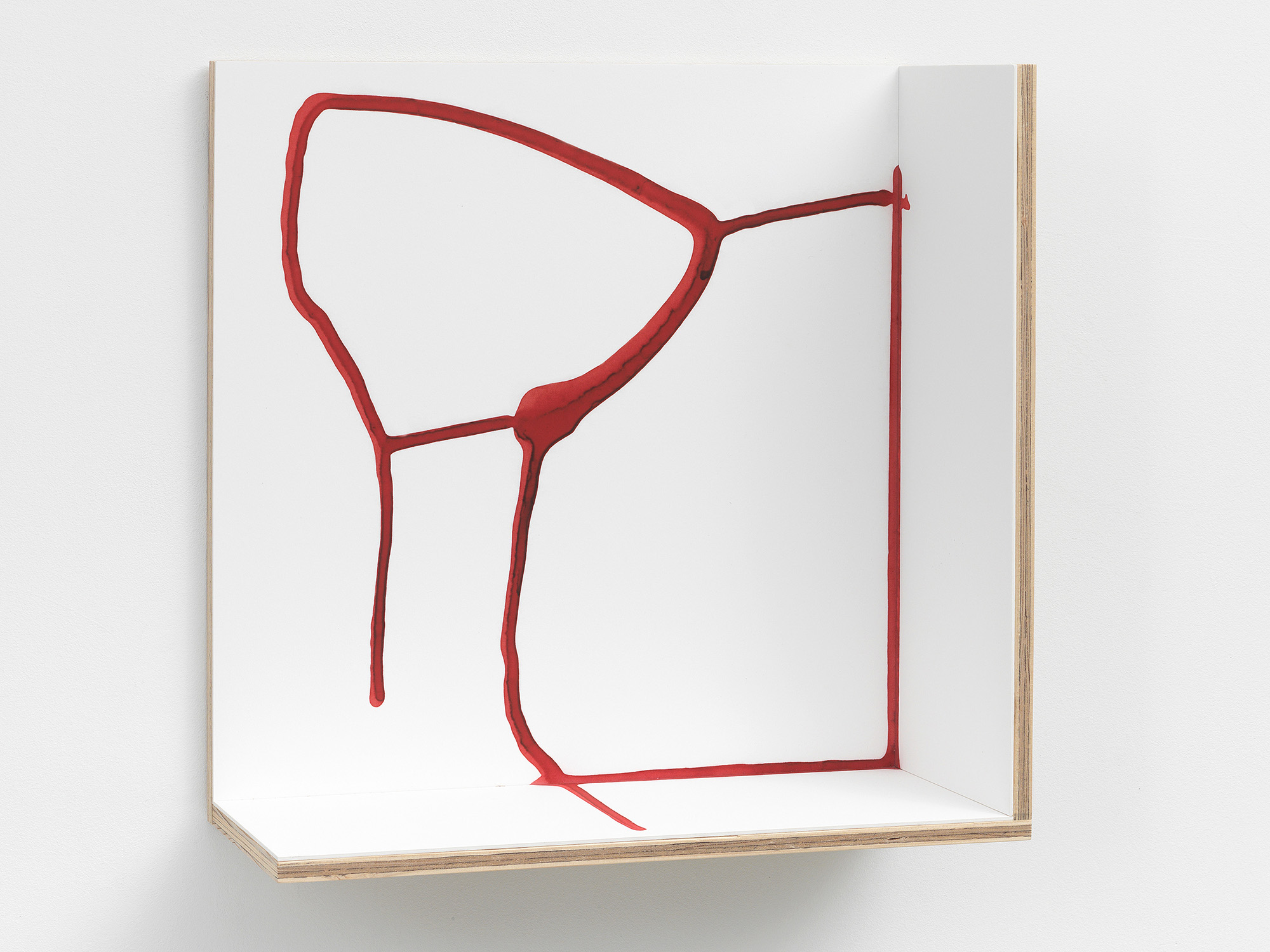 Rote Antik-Tusche auf Papier, Gipselemente, Sockelplatte aus MDF, 21.5 x 40 x 50 cm