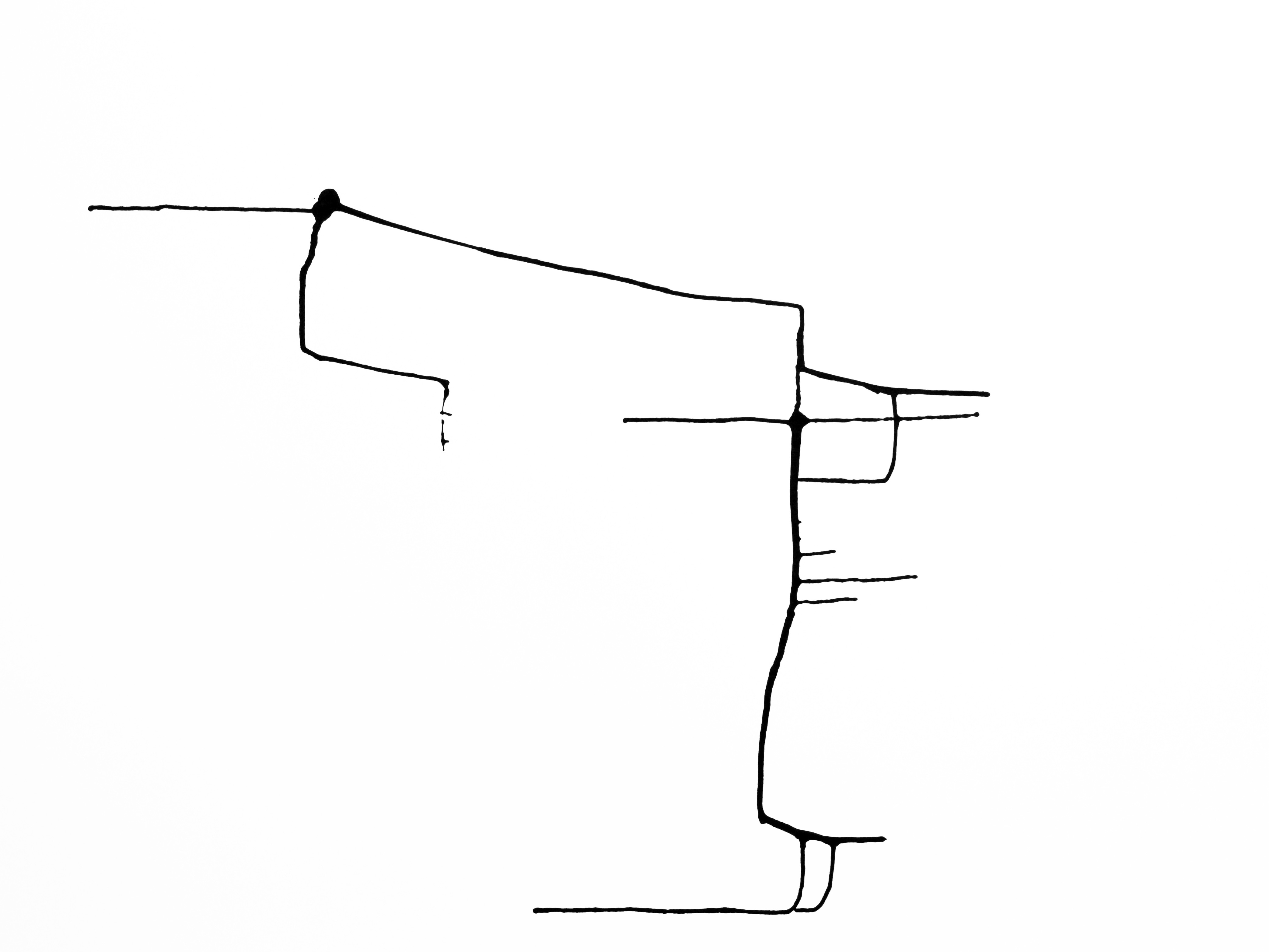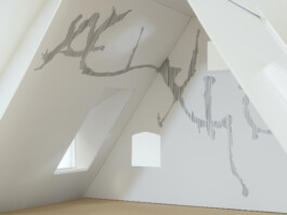 Ein gesetzter Tuschetropfen zieht sich über drei Raumseiten.